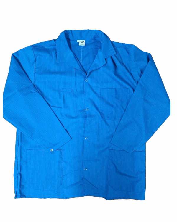 Bata antiestática de alta calidad, confeccionada en tela compuesta por 98% poliéster y 2% fibra de carbono, ideal para entornos que requieren control de estática en procesos industriales o electrónicos. Cuenta con cierre frontal de broches metálicos resistentes, tres bolsas funcionales para herramientas o accesorios, y diseño de manga larga que brinda protección completa. Disponible en color azul, ligera y cómoda para uso prolongado.