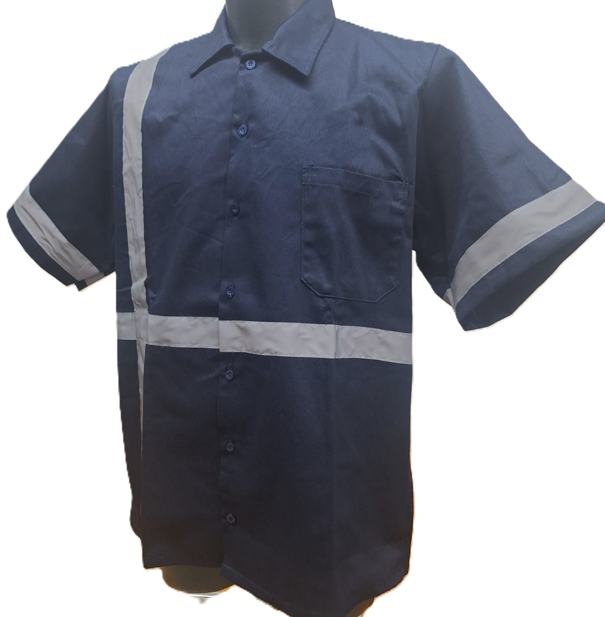 Camisa industrial de manga corta en color azul marino, confeccionada en tela resistente para trabajo pesado. Incorpora cintas reflejantes color plata dispuestas de forma horizontal y vertical al frente, así como en las mangas, para brindar mayor visibilidad y seguridad en ambientes de poca iluminación. Cuenta con cuello tipo camisero, cierre frontal con botones y un bolsillo en el pecho. Ideal para uso en industria, mantenimiento, transporte y servicios públicos.