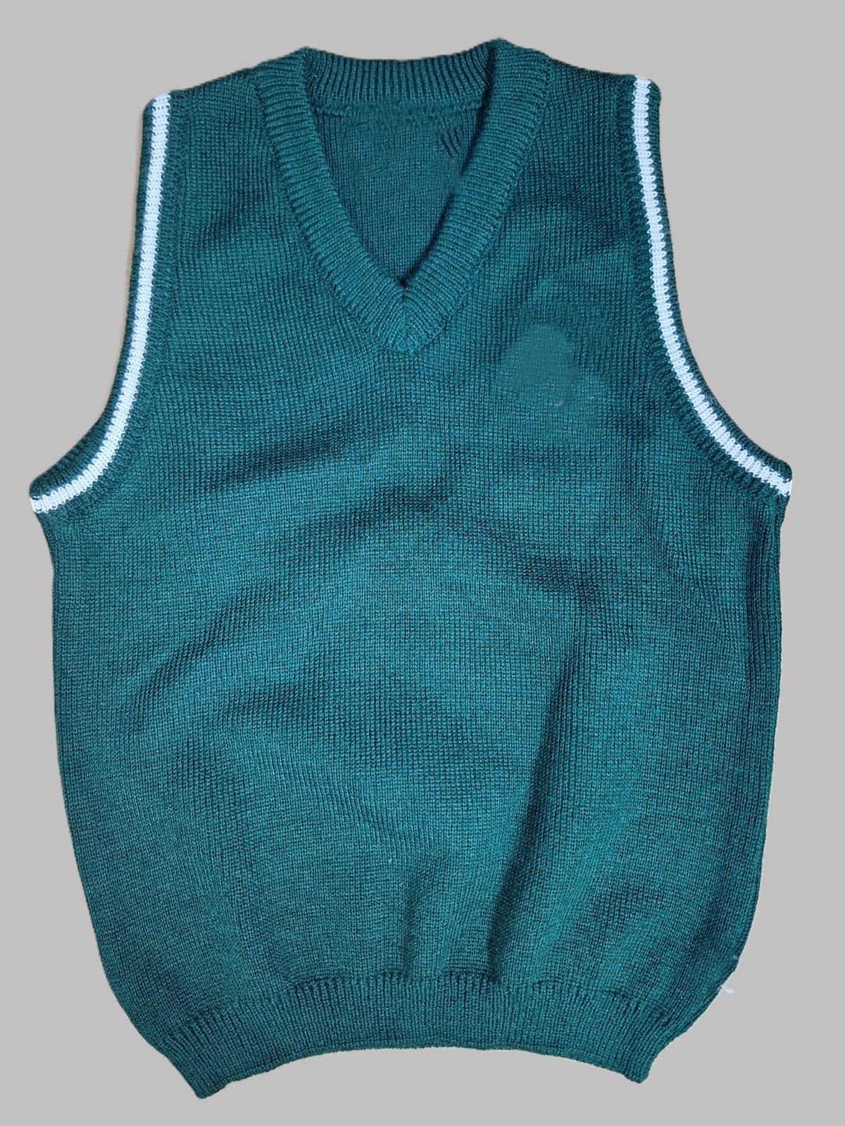 Chaleco escolar tejido sin mangas, con cuello en V. Ribete en sisa y cuello en contraste para un diseño clásico y formal. Aporta comodidad y libertad de movimiento, ideal para uso diario en uniforme escolar.