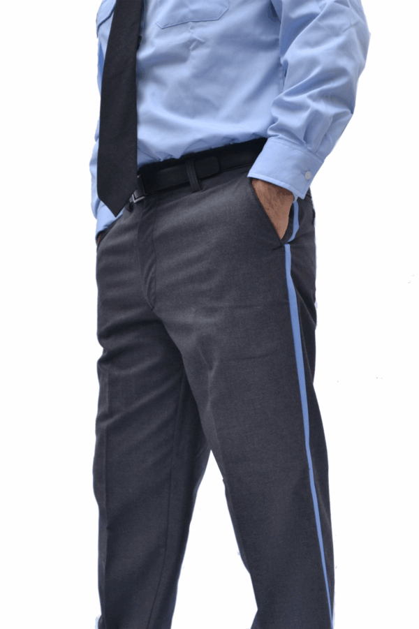 Pantalón tipo uniforme para guardia de seguridad o personal institucional, confeccionado en tela Tampa. Su diseño recto con franja lateral en contraste brinda una apariencia formal y distintiva. Ideal para cuerpos de vigilancia, seguridad privada o personal de atención uniformado.