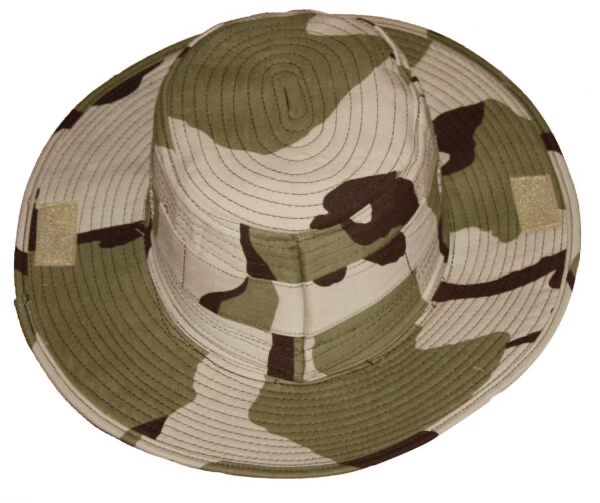 Sombrero táctico camuflado tipo selva/desierto, ideal para actividades al aire libre como caza, senderismo, exploración o uso táctico. Diseñado para ofrecer protección solar y camuflaje en entornos naturales, su ala ancha proporciona sombra y ventilación, mientras que la estructura de costura circular refuerza su durabilidad. Fabricado en tela resistente, incorpora cintas de velcro en la parte frontal para colocación de insignias o parches.